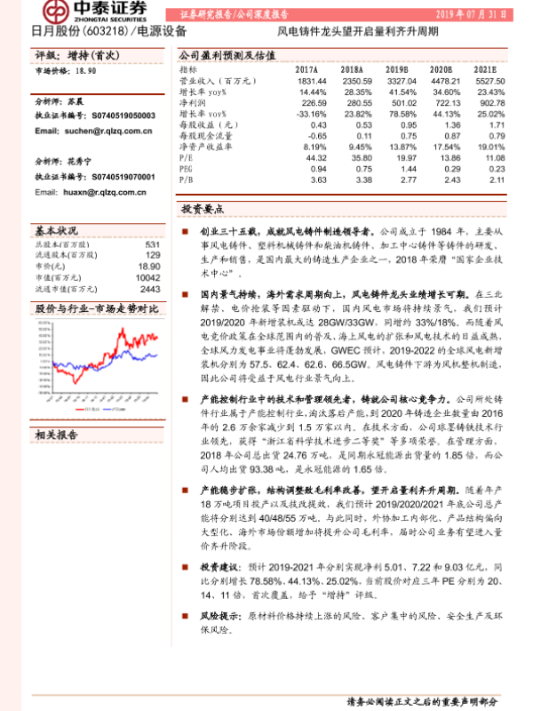 【中泰证券】【20190731】日月股份-603218.SH-风电铸件龙头望开启量利齐升周期-30页 行业研究