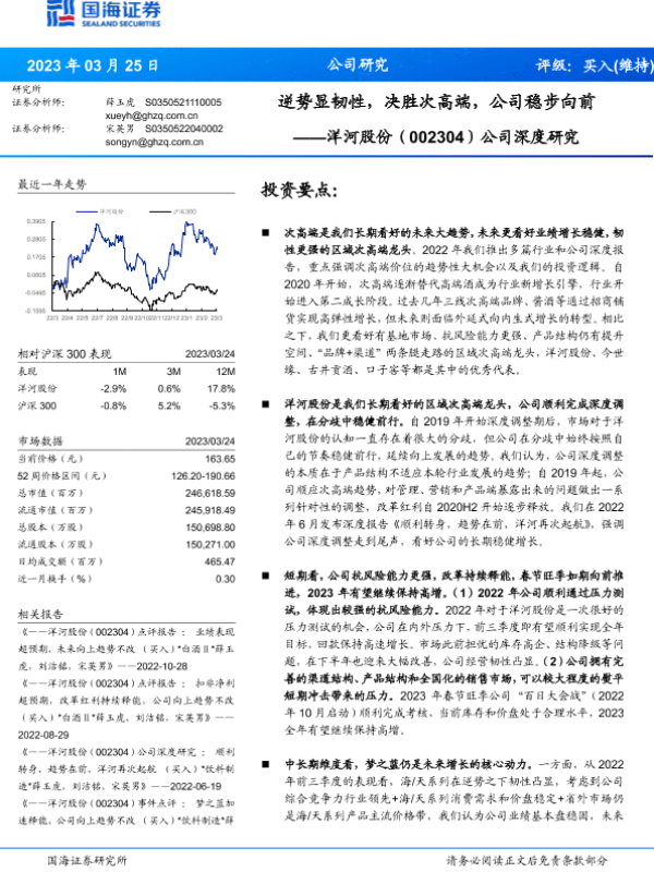 【国海证券】【20230325】【洋河股份】公司深度研究:逆势显韧性,决胜次高端,公司稳步向前-20页 行业研究