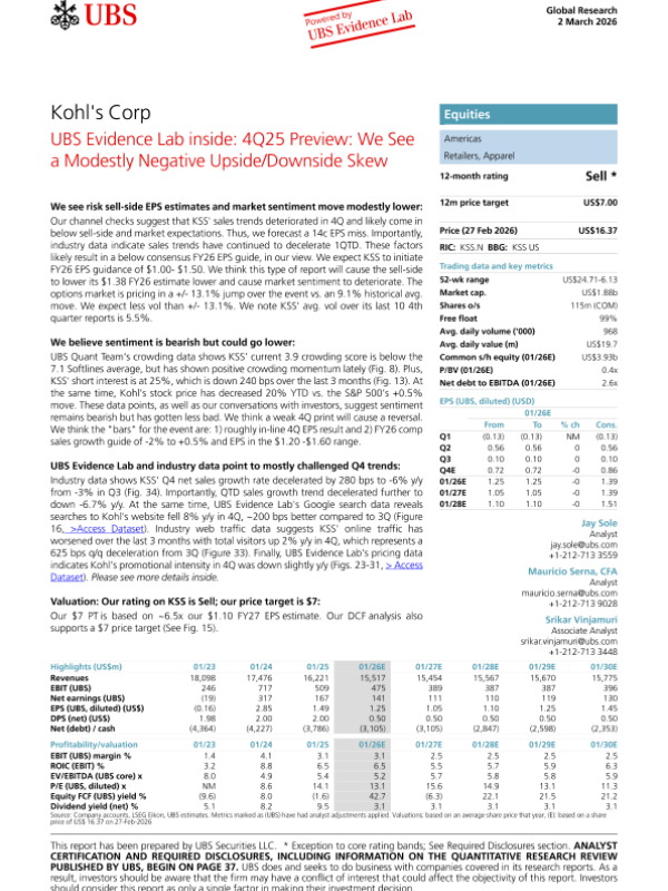 【UBS】【202602】Kohl's Corp UBS Evidence Lab inside 4Q25 Preview We See a Modestly Negative Upside/Downside Skew-46页 证券期货研究报告