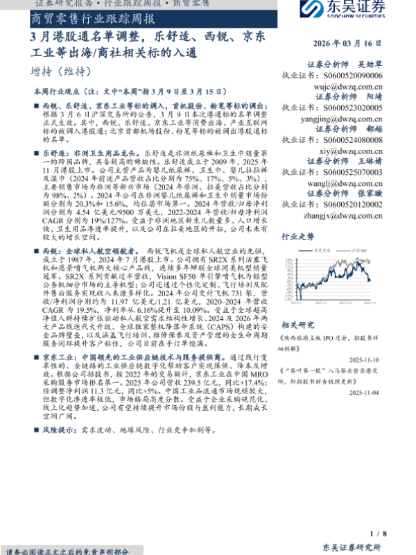 【东吴证券】【202603】商贸零售行业跟踪周报:3月港股通名单调整,乐舒适、西锐、京东工业等出海/商社相关标的入通-8页 证券期货研究报告