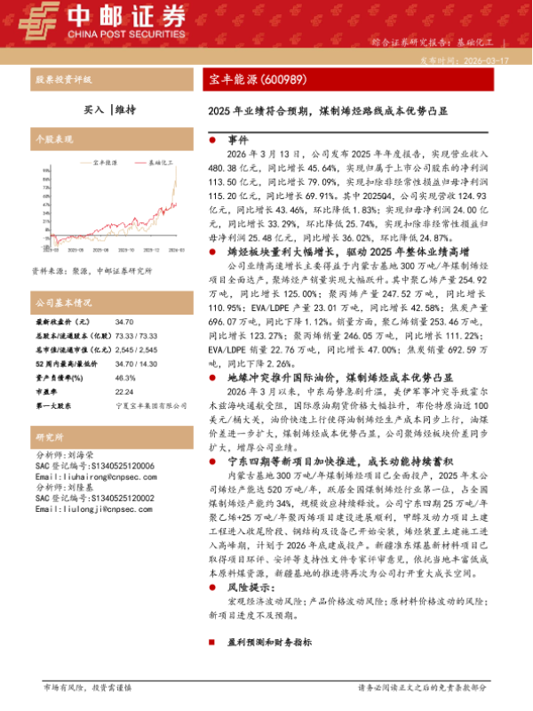 【中邮证券】【202603】2025年业绩符合预期,煤制烯烃路线成本优势凸显-5页 证券期货研究报告