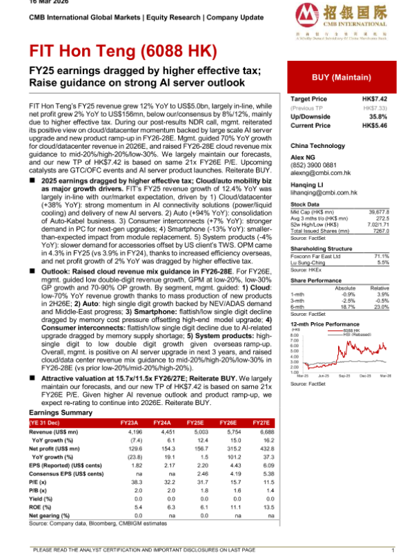 【CMB International Global Markets】【202603】FIT Hon Teng(6088 HK)- FY25 earnings dragged by higher effective tax; Raise guidance on strong AI server outlook-7页 证券期货研究报告