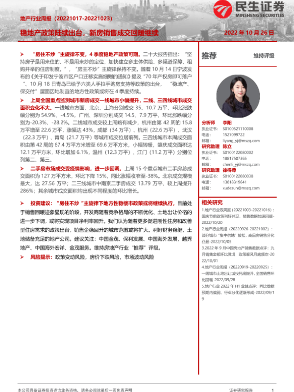 【民生证券】【20221026】地产行业周报:稳地产政策陆续出台,新房销售成交回暖继续-20页 行业研究