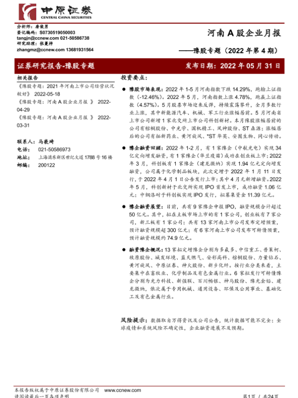 【中原证券】【20220531】豫股专题(2022年第4期):河南A股企业月报-24页 行业研究