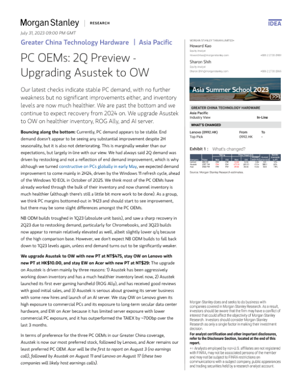 【Morgan Stanley】【20230711】Greater China Technology Hardware PC OEMs 2Q Preview - Upgrading Asustek to OW-44页 行业研究