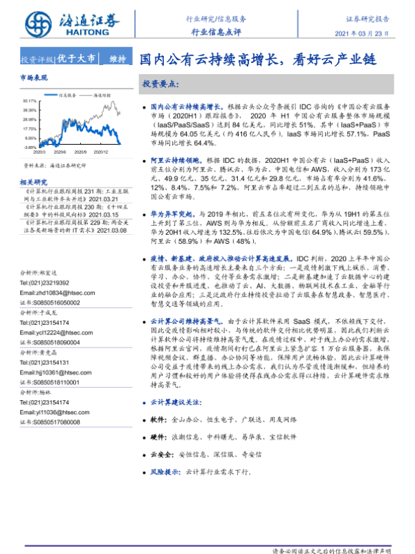 【海通证券】【20210323】信息服务行业信息点评:国内公有云持续高增长,看好云产业链-2页 行业研究