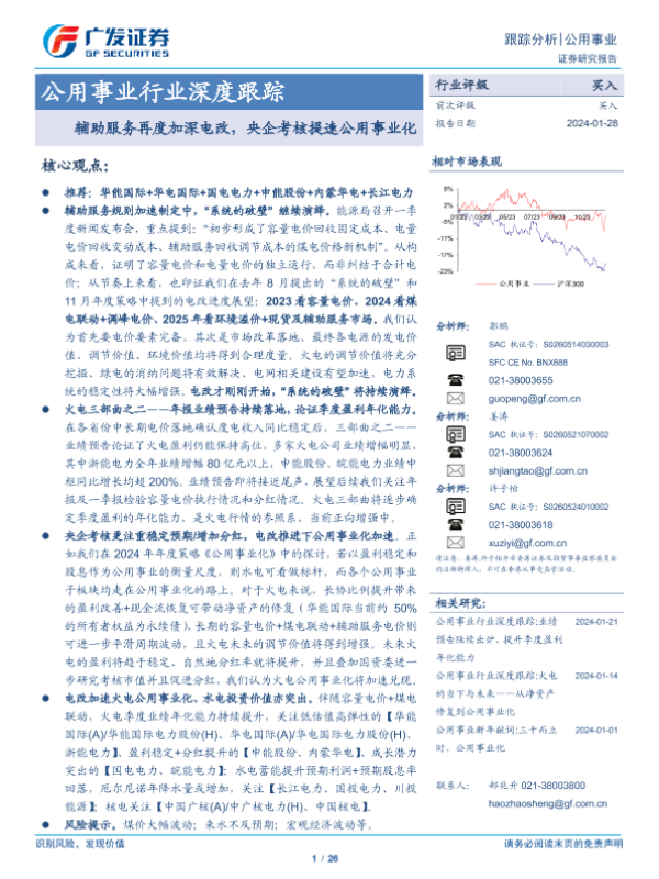 【广发证券】【20240128】公用事业行业深度跟踪:辅助服务再度加深电改,央企考核提速公用事业化-26页 行业研究