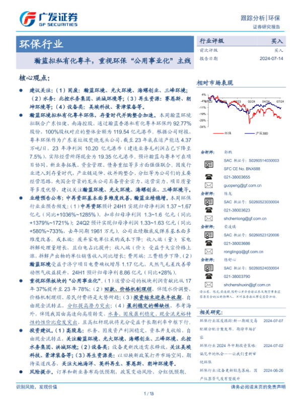 【广发证券】【20240714】环保行业跟踪分析:瀚蓝拟私有化粤丰,重视环保“公用事业化”主线-13页 行业研究
