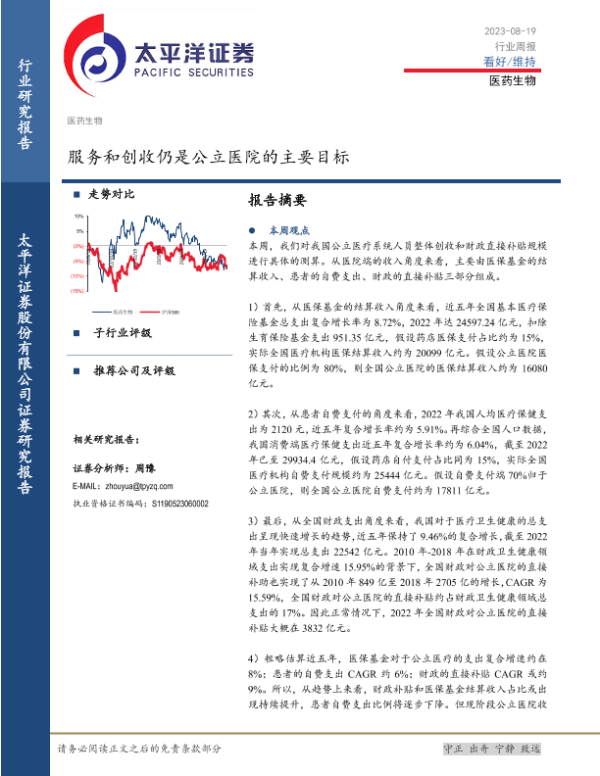 【太平洋证券】【20230819】医药生物行业周报:服务和创收仍是公立医院的主要目标-20页 行业研究