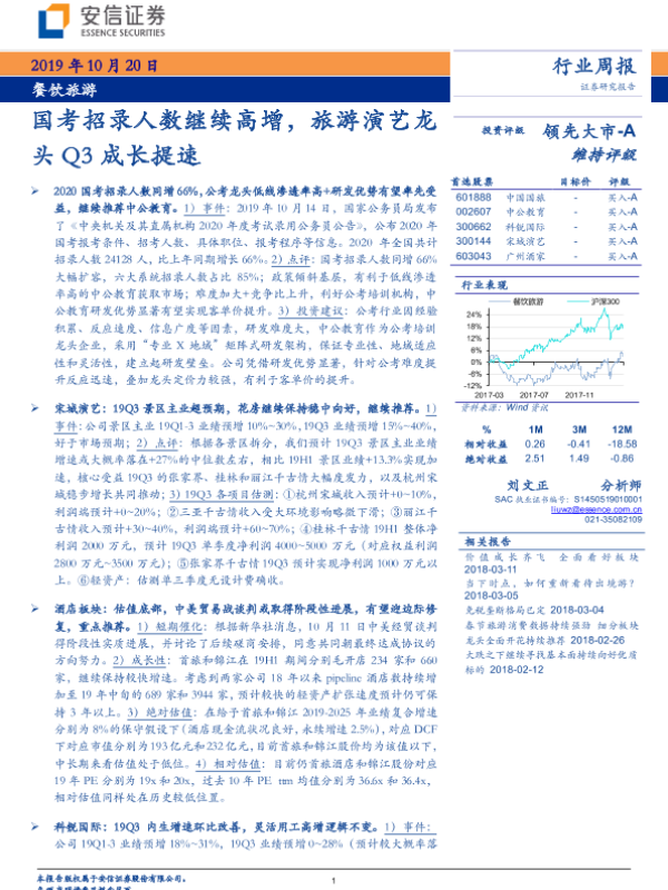 【安信证券】【20191020】餐饮旅游行业周报:国考招录人数继续高增,旅游演艺龙头Q3成长提速-20页 行业研究
