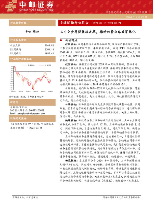【中邮证券】【20240721】交通运输行业报告:三中全会再提铁路改革,推动收费公路政策优化-32页 行业研究
