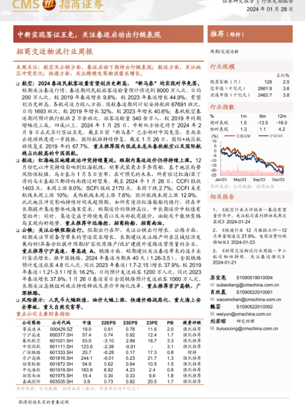 【海通证券】【20240128】招商交运物流行业周报:中新实现签证互免,关注春运启动出行链表现-16页 行业研究
