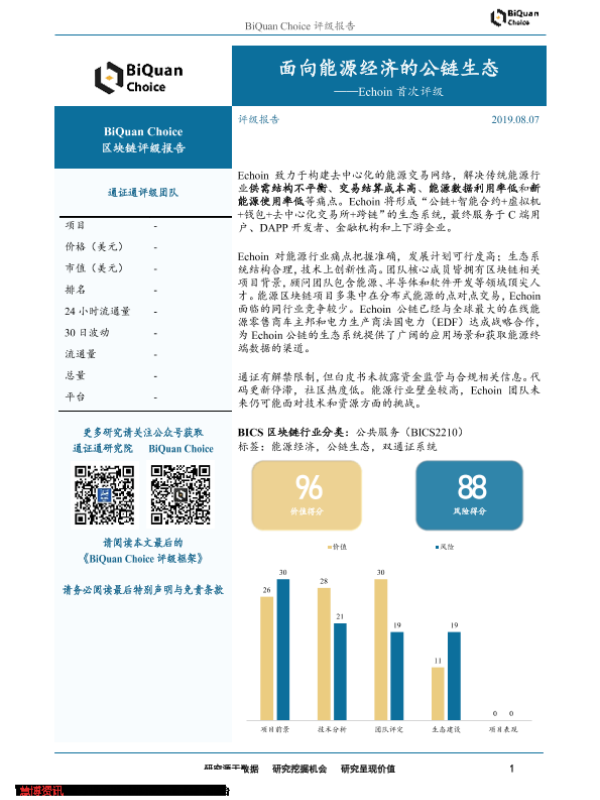【通证通研究院】【20190807】区块链评级报告:Echoin首次评级-面向能源经济的公链生态-3页 行业研究