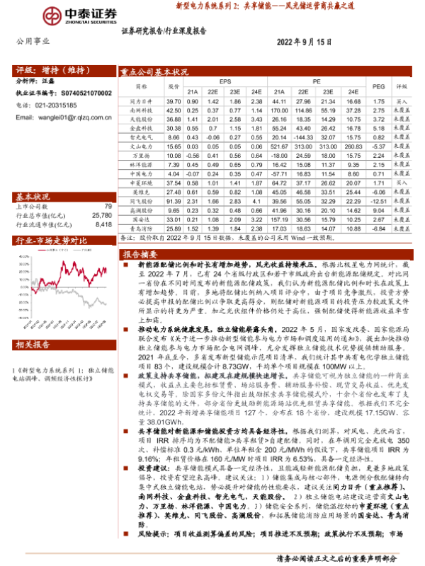 【中泰证券】【20220915】公用事业行业新型电力系统系列2:共享储能_风光储运营商共赢之道-20页 行业研究