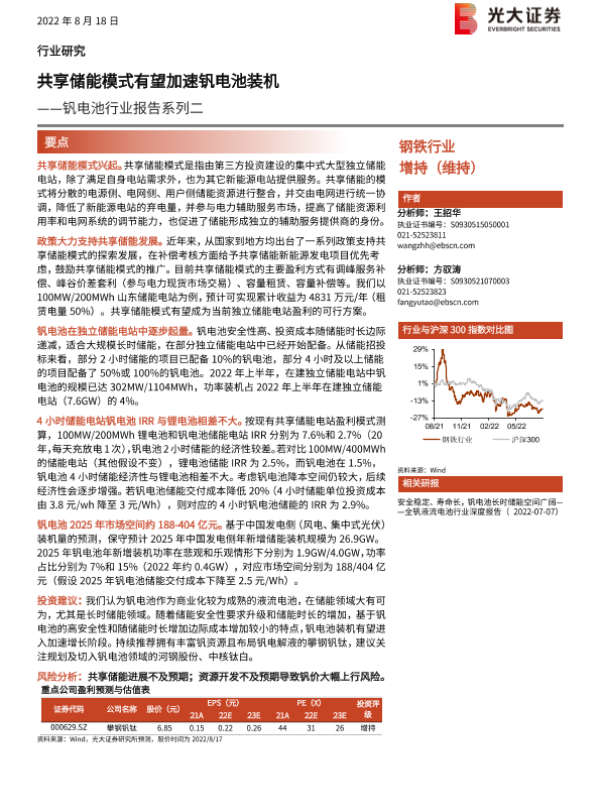 【光大证券】【20220818】钒电池行业报告系列二:共享储能模式有望加速钒电池装机-16页 行业研究