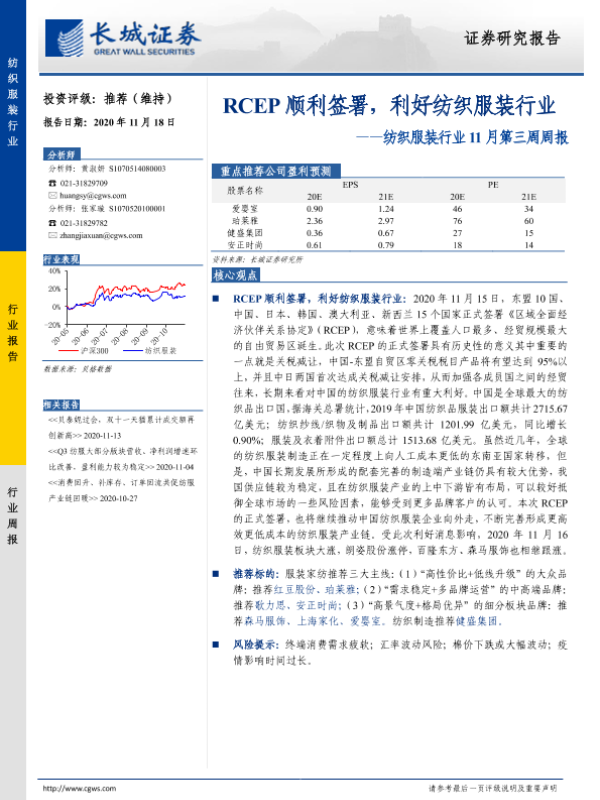 【长城证券】【20201118】20201118-长城证券-纺织服装行业11月第三周周报:RCEP顺利签署,利好纺织服装行业-21页 行业研究