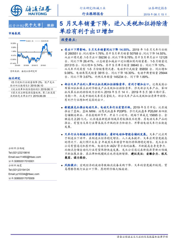 【海通证券】【20190615】机械工业行业跟踪报告:5月叉车销量下降,进入关税加征排除清单后有利于出口增加-6页 行业研究