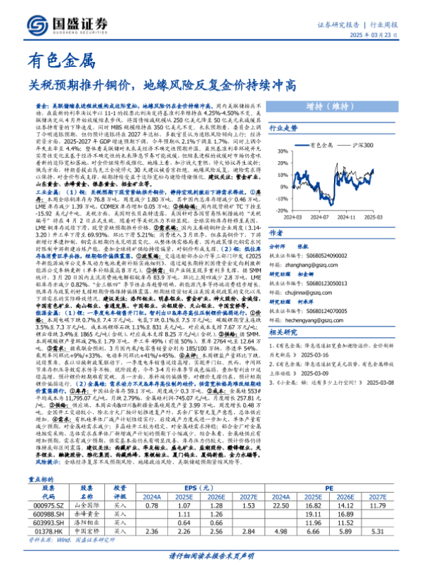 【国盛证券】【20250323】20250323-国盛证券-有色金属行业周报:关税预期推升铜价,地缘风险反复金价持续冲高-28页 行业研究