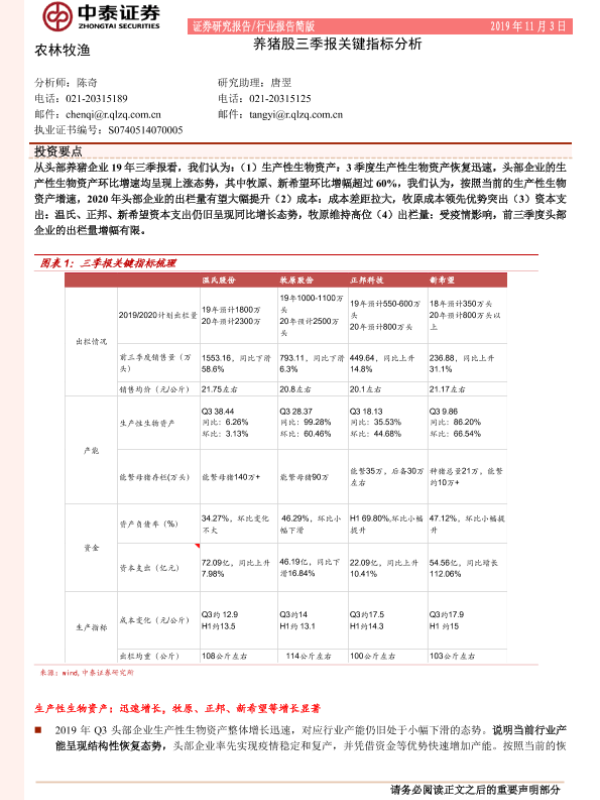 【中泰证券】【20191103】农林牧渔:养猪股三季报关键指标分析-11页 行业研究