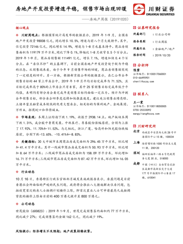 【川财证券】【20191020】房地产开发投资增速平稳,销售市场出现回暖-10页 行业研究