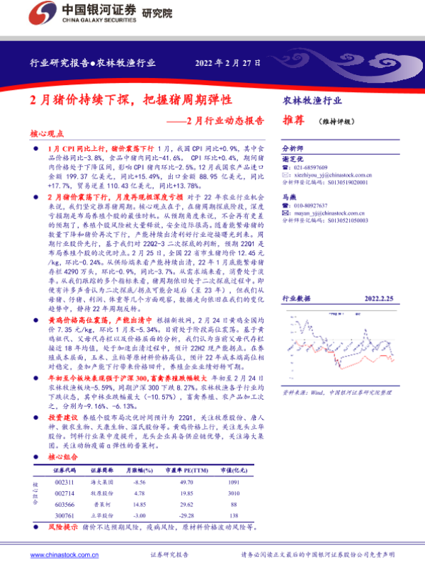 【银河证券】【20220227】农林牧渔行业2月行业动态报告:2月猪价持续下探,把握猪周期弹性-25页 行业研究