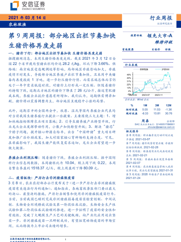 【安信证券】【20210314】农林牧渔第9周周报:部分地区出栏节奏加快生猪价格再度走弱-21页 行业研究