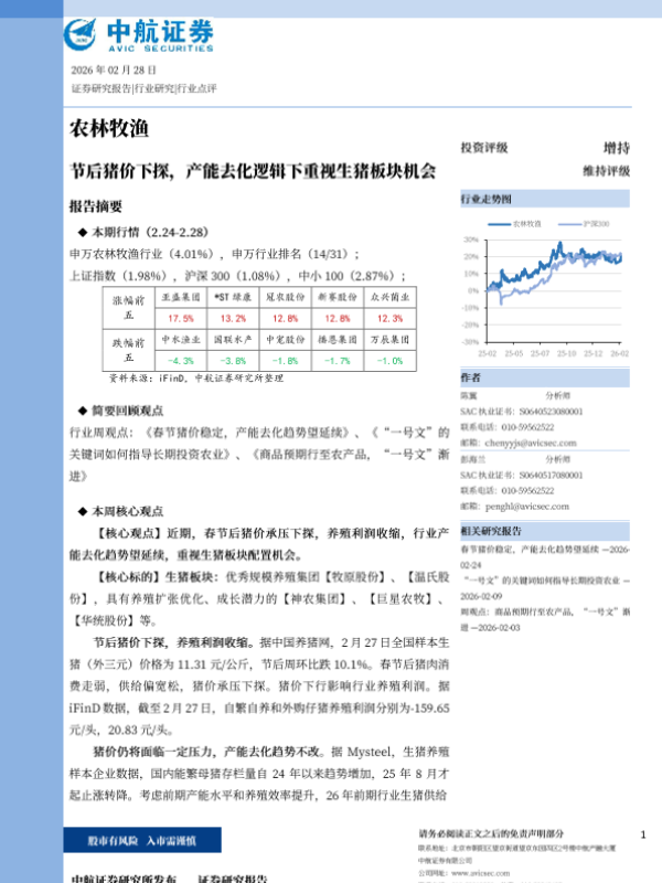 【中航证券】【202303】农林牧渔:节后猪价下探,产能去化逻辑下重视生猪板块机会-13页 证券期货研究报告