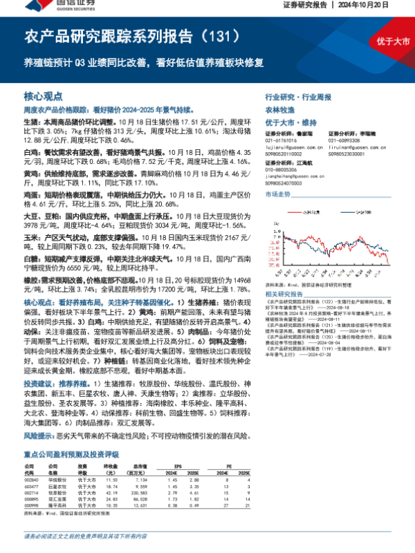【国信证券】【20241020】20241020-国信证券-农产品研究跟踪系列报告(131):养殖链预计Q3业绩同比改善,看好低估值养殖板块修复-26页 行业研究