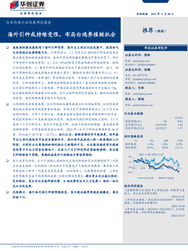 【华创证券】【20221108】白羽肉鸡行业深度研究报告:海外引种或持续受限,布局白鸡养殖链机会-23页 行业研究