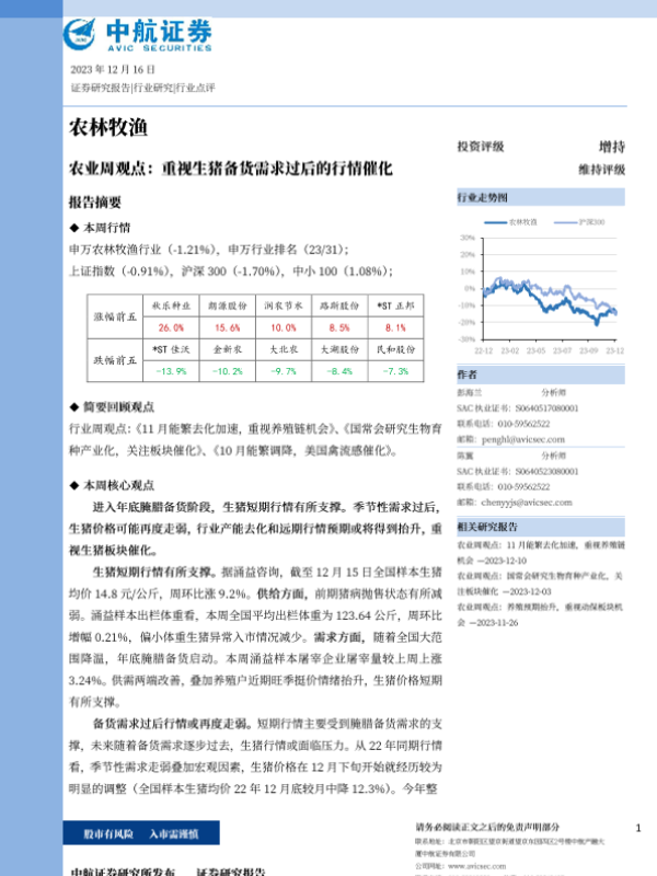 【中航证券】【20231216】农业周观点:重视生猪备货需求过后的行情催化-13页 行业研究