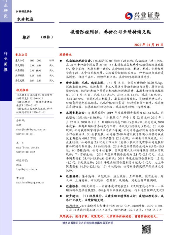 【兴业证券】【20200119】疫情防控到位,养猪公司业绩持续兑现-15页 行业研究