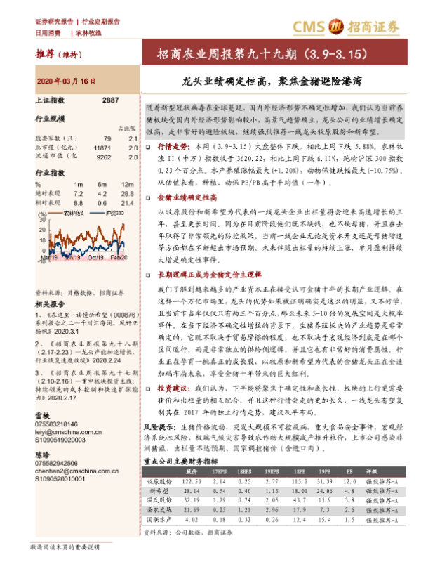 【海通证券】【20200316】农业周报第九十九期:龙头业绩确定性高,聚焦金猪避险港湾-25页 证券期货研究报告