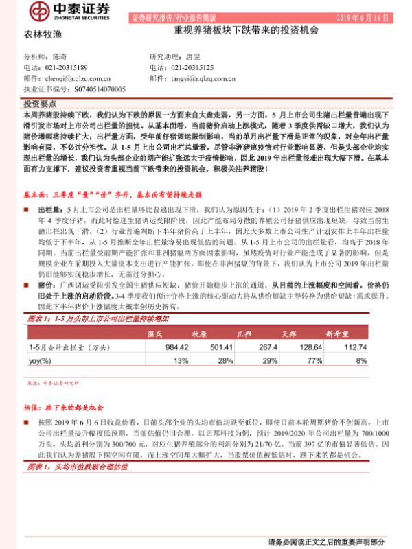 【中泰证券】【20190616】农林牧渔:重视养猪板块下跌带来的投资机会-11页 行业研究