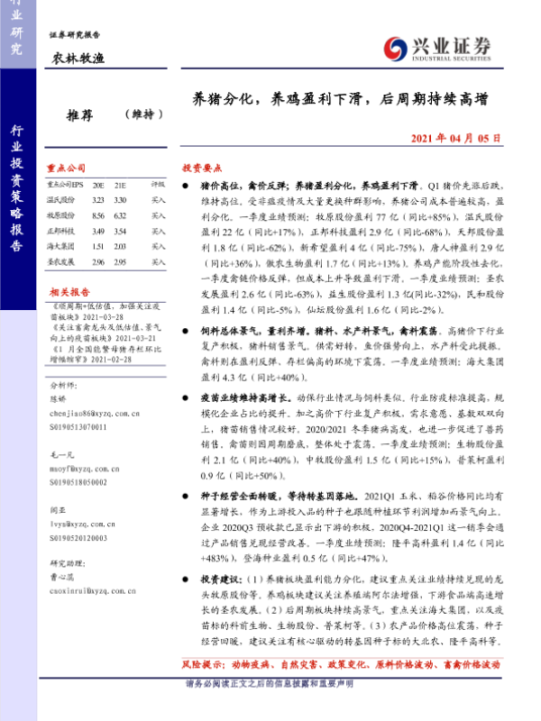 【兴业证券】【20210405】20210405-兴业证券-农林牧渔行业投资策略报告:养猪分化,养鸡盈利下滑,后周期持续高增-12页 行业研究