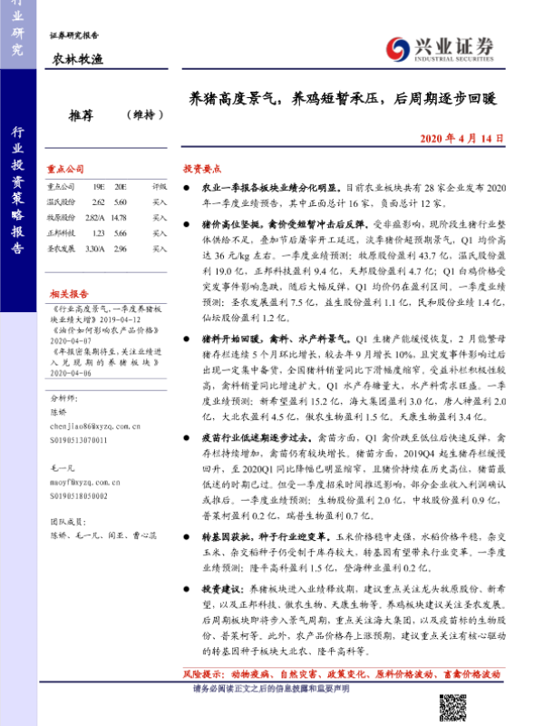 【兴业证券】【20200414】20200414-兴业证券-农林牧渔:养猪高度景气,养鸡短暂承压,后周期逐步回暖-17页 行业研究