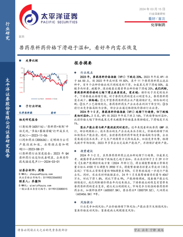 【太平洋证券】【20240315】化学制药行业深度研究:兽药原料药价格下滑趋于温和,看好年内需求恢复-11页 行业研究