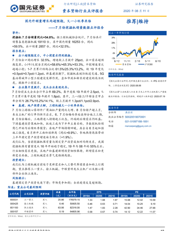 【国元证券】【20200811】7月份挖掘机销量数据点评报告:国内外销量增长均超预期,又一小旺季来临-2页 行业研究