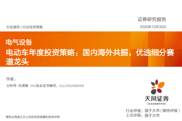 【天风证券】【20201230】电动车年度投资策略:国内海外共振,优选细分赛道龙头-68页 行业研究