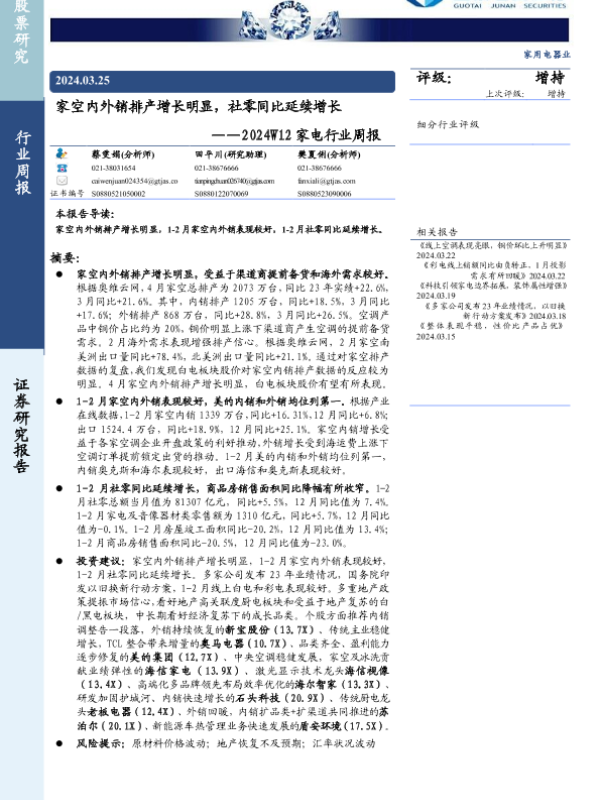 【国泰君安证券】【20240325】2024W12家电行业周报:家空内外销排产增长明显,社零同比延续增长-14页 行业研究