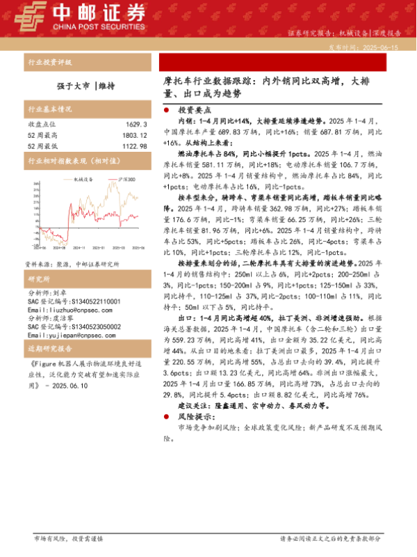 【中邮证券】【20250615】摩托车行业数据跟踪:内外销同比双高增,大排量、出口成为趋势-11页 证券期货研究报告
