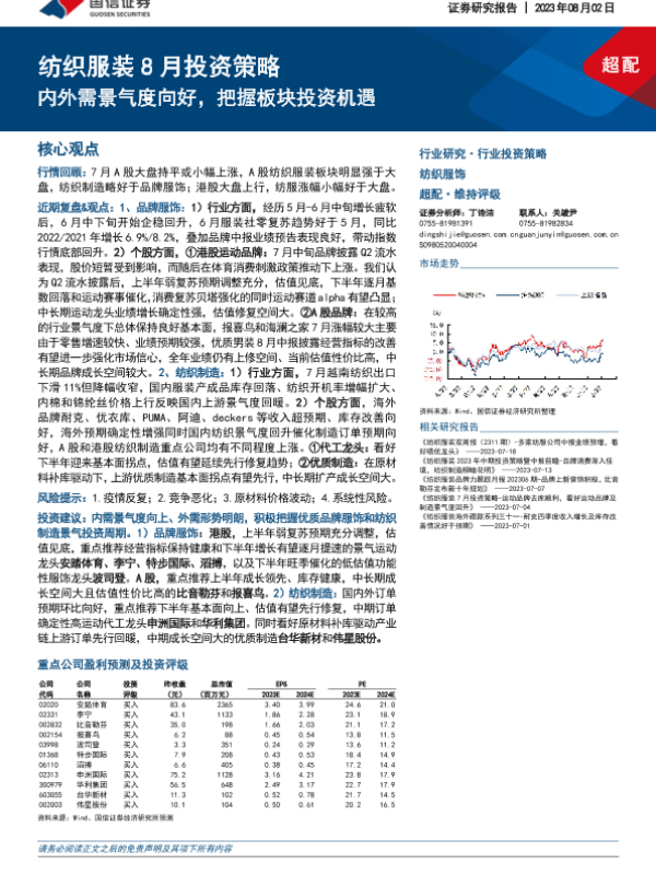 【国信证券】【20230802】20230802-国信证券-纺织服装8月投资策略:内外需景气度向好,把握板块投资机遇-22页 行业研究