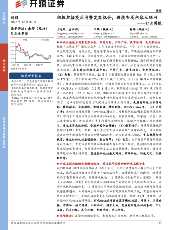 【开源证券】【20221204】传媒行业周报:积极把握疫后消费复苏机会,继续布局内容互联网-15页 行业研究