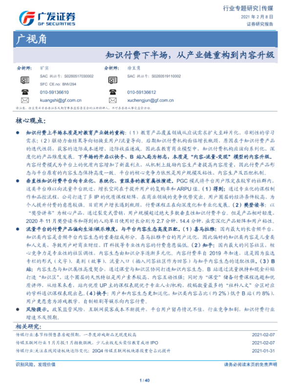 【广发证券】【20210208】2021.02.08-传媒行业广视角:知识付费下半场,从产业链重构到内容升级-40页 行业研究