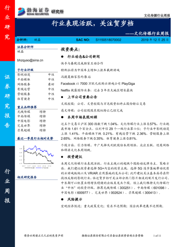 【渤海证券】【20191225】20191225-渤海证券-文化传媒行业周报:行业表现活跃,关注贺岁档-11页 行业研究