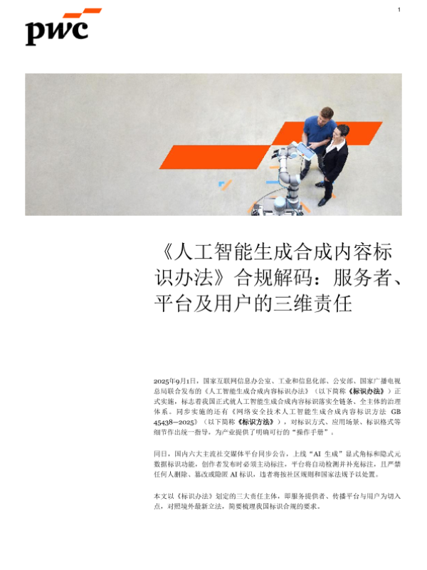 【普华永道&程伟宾律师事务所】【202509】《人工智能生成合成内容标识办法》合规解码:服务者、平台及用户的三维责任-14页 政策文件
