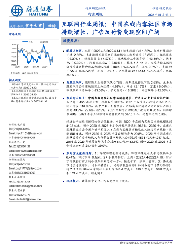 【海通证券】【20220416】互联网行业周报:中国在线内容社区市场持续增长,广告及付费变现空间广阔-9页 行业研究