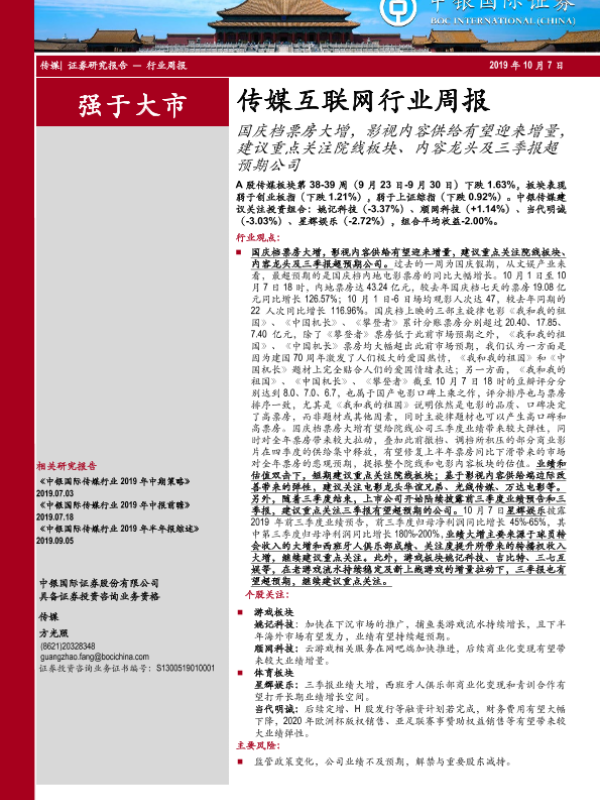 【中银证券】【20191007】20191007-中银证券-传媒互联网行业周报:国庆档票房大增,影视内容供给有望迎来增量,建议重点关注院线板块、内容龙头及三季报超预期公司-23页 行业研究