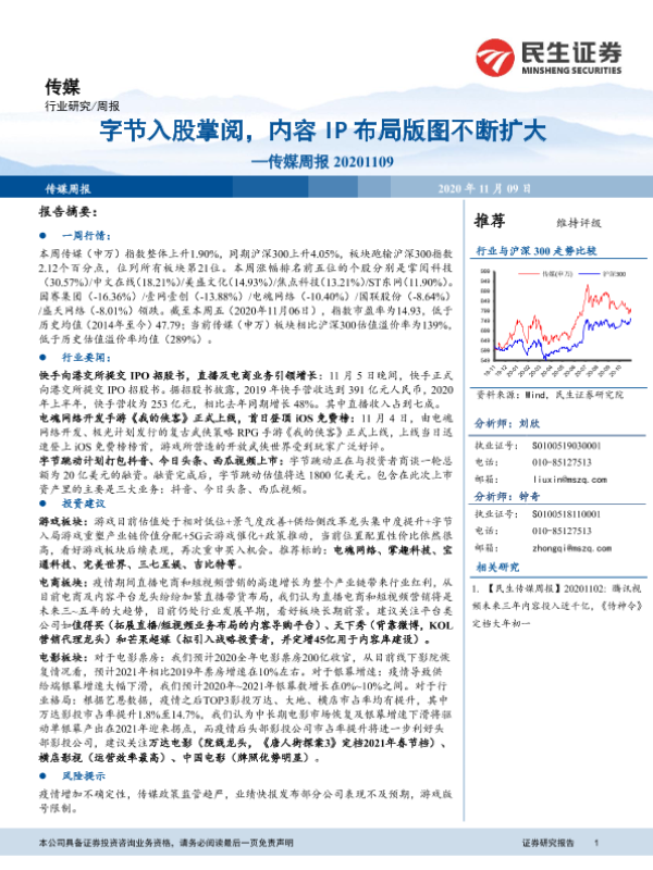 【民生证券】【20201109】20201109-民生证券-传媒周报:字节入股掌阅,内容IP布局版图不断扩大-17页 行业研究