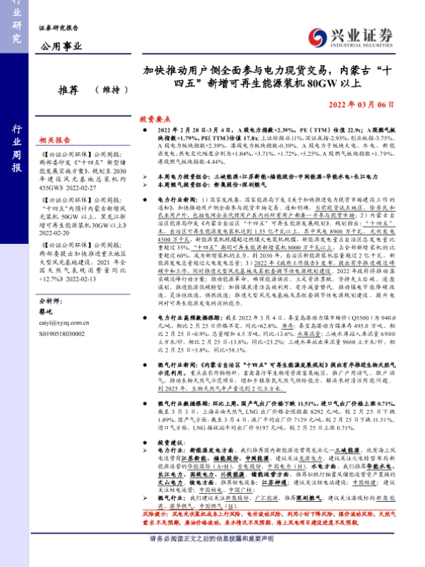 【兴业证券】【20220306】加快推动用户侧全面参与电力现货交易,内蒙古“十四五”新增可再生能源装机80GW以上-21页 行业研究