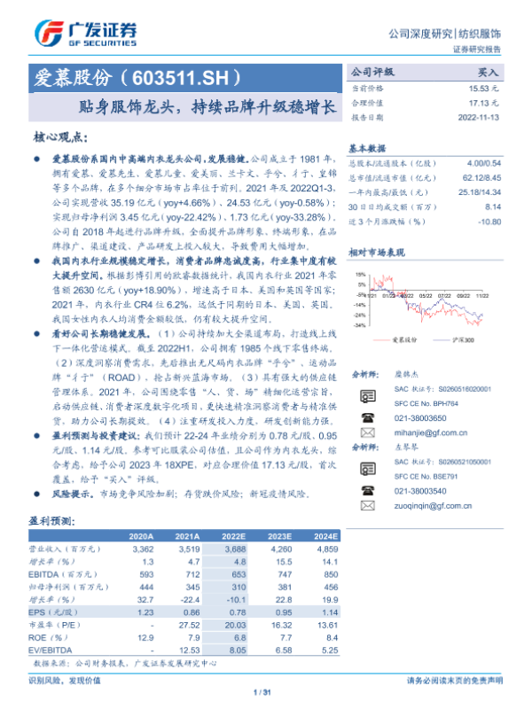 【广发证券】【20221113】爱慕股份(603511.SH):贴身服饰龙头,持续品牌升级稳增长-31页 行业研究